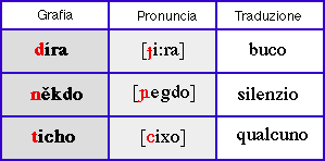 Ad esempio, le consonanti dure d n t, vengono pronunciate normalmente quando sono seguite dalle vocali dure e ed y, ma qualora siano seguite dalle vocali molli ě ed i si leggono come fossero i loro equivalenti molli d' ň t'.