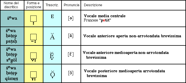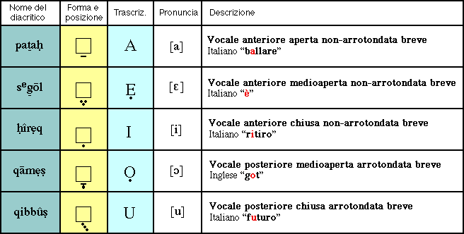 I diacritici posti a indicare le vocali brevi sono: pataḥ, segōl, ḥîrẹq, qāmẹṣ e qibbûṣ.