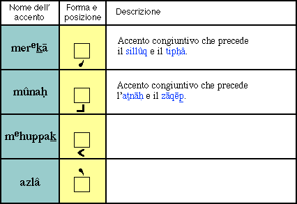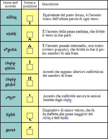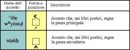 Si tenga comunque presente che nei tre libri poetici della Bibbia (Salmi, Giobbe, Proverbi), il sistema di accenti era differente. Se nel verso vi erano due grandi pause, queste erano segnate dai seguenti accenti: