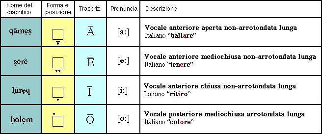 Le vocali medie sono distinte dai seguenti diacritici: qāmẹṣ, ṣērê, ḥîrẹq e ḥōlẹm.