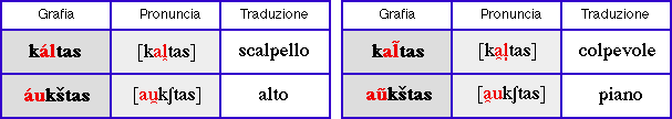 L'intonazione in lituano è distintiva di significato, distinguendo parole altrimenti uguali. Nelle trascrizioni in alfabeto fonetico, il piccolo segno sotto una delle due vocali del dittongo indica qualle delle due vocali non è accentata (la l accentata diventa ovviamente apice sillabico e viene a pronunciarsi come la l del cèco "vlk" o la l finale dell'inglese "little").
