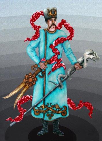 ombelichi» e «sostenitore della yurt in ordine», cavalca un grigio cavallo e difende dagli spiriti maligni e