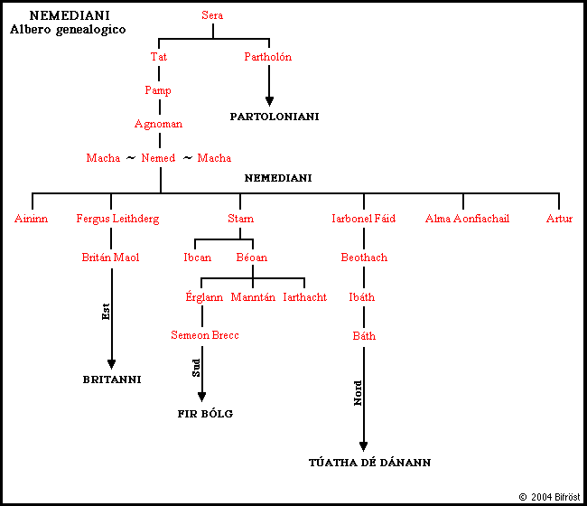 di Tat figlio di Sera, figlio di Srú, figlio di Esrú, figlio di Fraimint, figlio di Fáthacht (o Aithecht) figlio di Magog, figlio di Iafeth figlio di Noe.