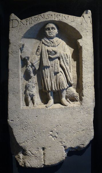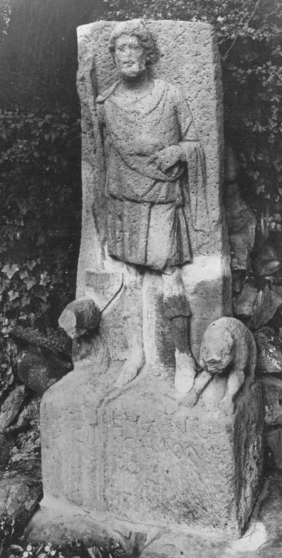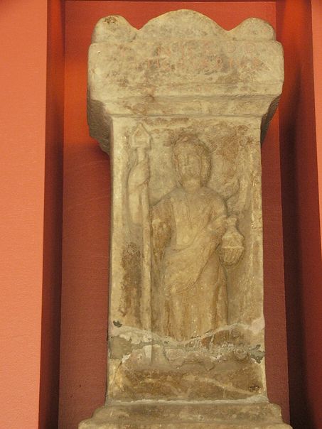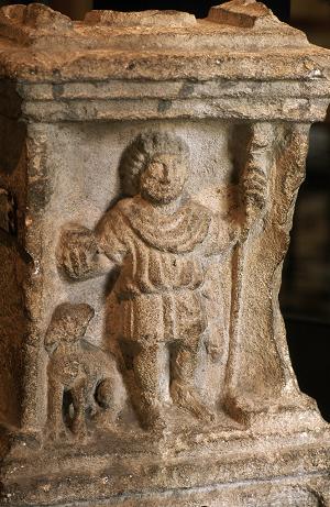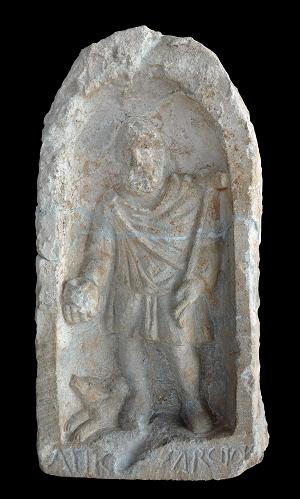 accompagnato da un cane. Su un altare rinvenuto a Vacquerolles, vicino Nîmes (Gard, Francia), il dio è ritratto