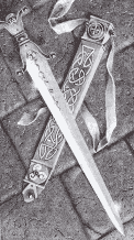 «Spada di luce». La spada di Núada Aircetlám, proveniente dalla città boreale di Finias. Era uno dei quattro tesori dei Túatha Dé Dánann. Gli altri tre erano: la pietra Lía Fáil, la lancia Sleá Bua, il calderone Coire an Dagdae.