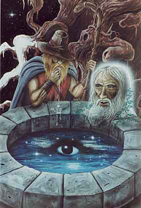 Óðinn vi lascia il suo occhio [QUI]. La völva rinfaccia ad Óðinn di avervi lasciato il suo occhio in cambio di un sorso [QUI]. A questo pozzo attinge la prima radice del frassino Yggdrasill [QUI].