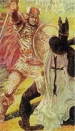 interamente vestito di nero, che si recò dall'eroe e lo sfidò a duello.
